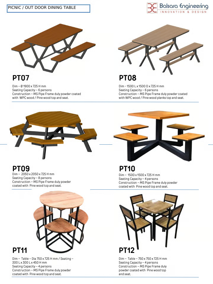 Picnic / Outdoor Tables Explore our wide range of products page for Balsara Engineering where you can find detailed images, product options, and other related products. Learn More Products That We Offer Elevate Your Space with Our Exquisite Furniture Collection Garden Swings Dustbins/Litter Bins Picnic/Outdoor Tables Folding Table Hotel/Restaurant/ Café Tables School Furniture Our Office Registered Address : 06, Amrut Kunj, Mahim Road, Palghar West. Palghar 401404Works : Gala No. 1 & 2, Ganesh Nagar, Dewan & Sons road, near GST Office, Vevoor, Palghar east Palghar 401404 HoursMonday – Sunday9.00am – 6.00pmContacts+919870276631 +91 8087257045balsaraent@gmail.com
